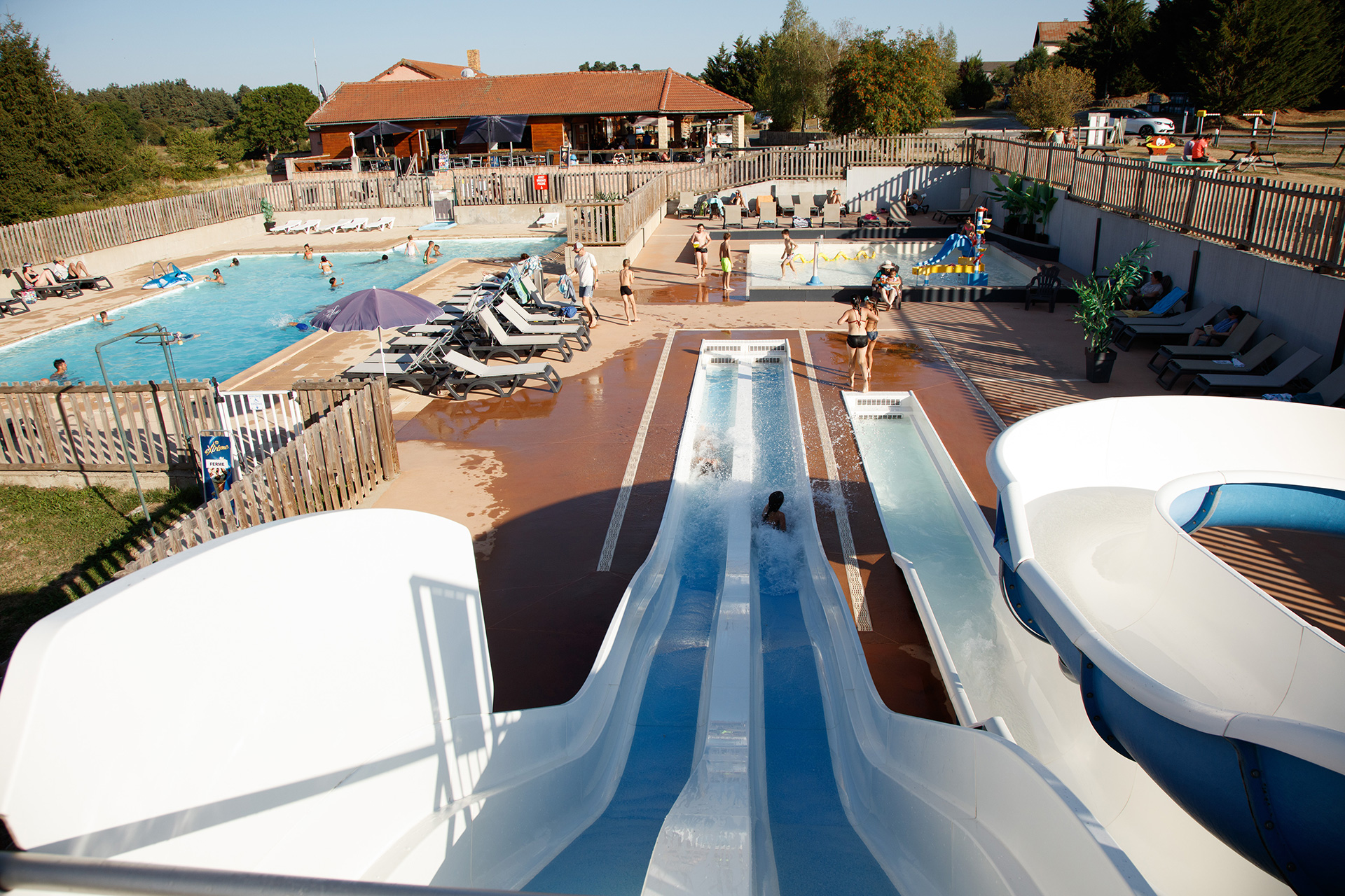 Entre parc aquatique, camping avec piscine chauffée et lac de Naussac, l’eau fait partie des plaisirs essentiels du séjour aux Sous-Bois du Lac.
