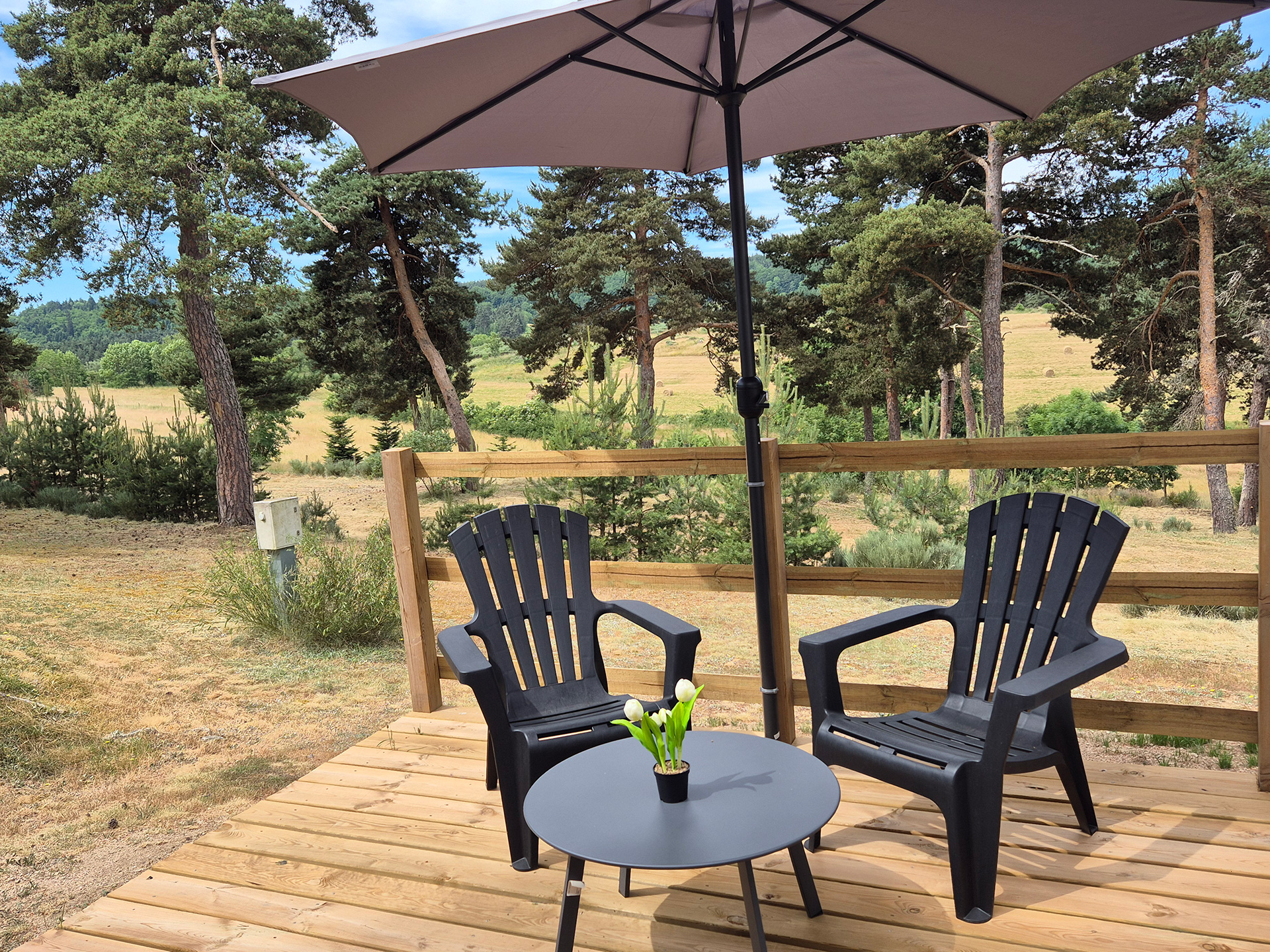 La terrasse semi-couverte de 18 m² prolonge naturellement l’hébergement et permet de profiter pleinement de l’extérieur.