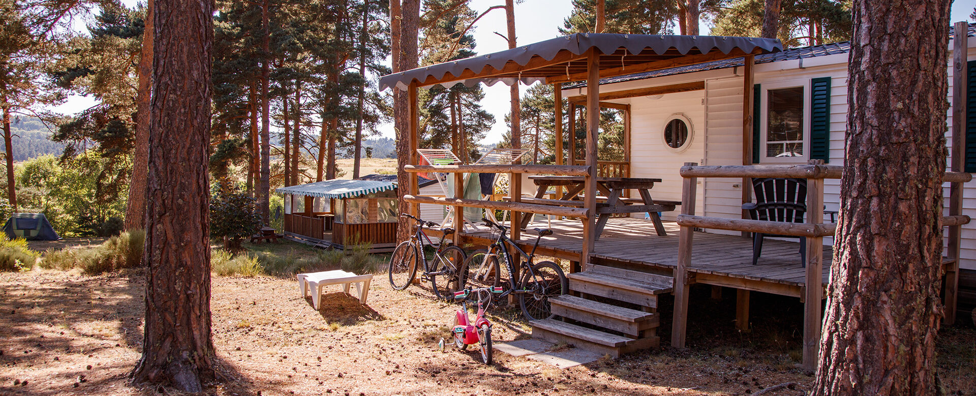Un coin de nature sous les pins dans un mobil-home classique 3 chambres en Lozère